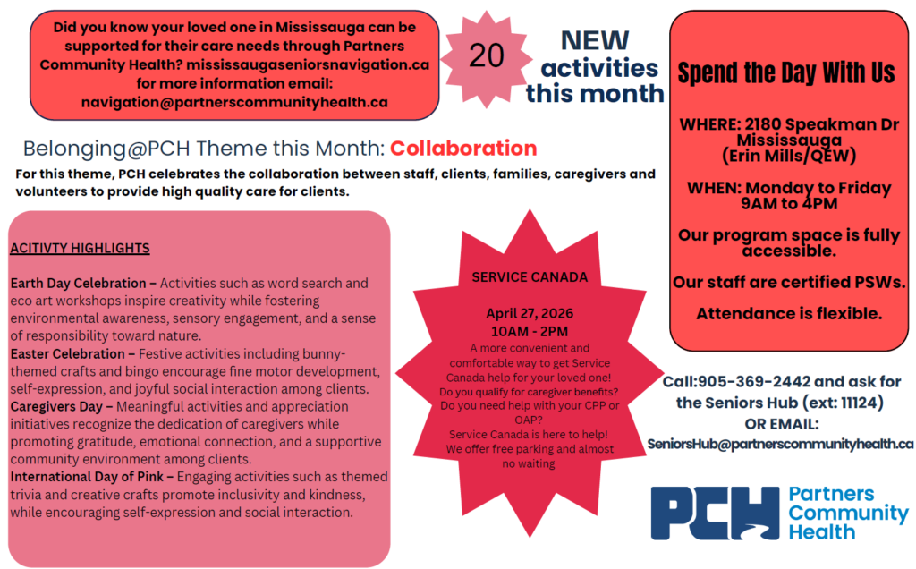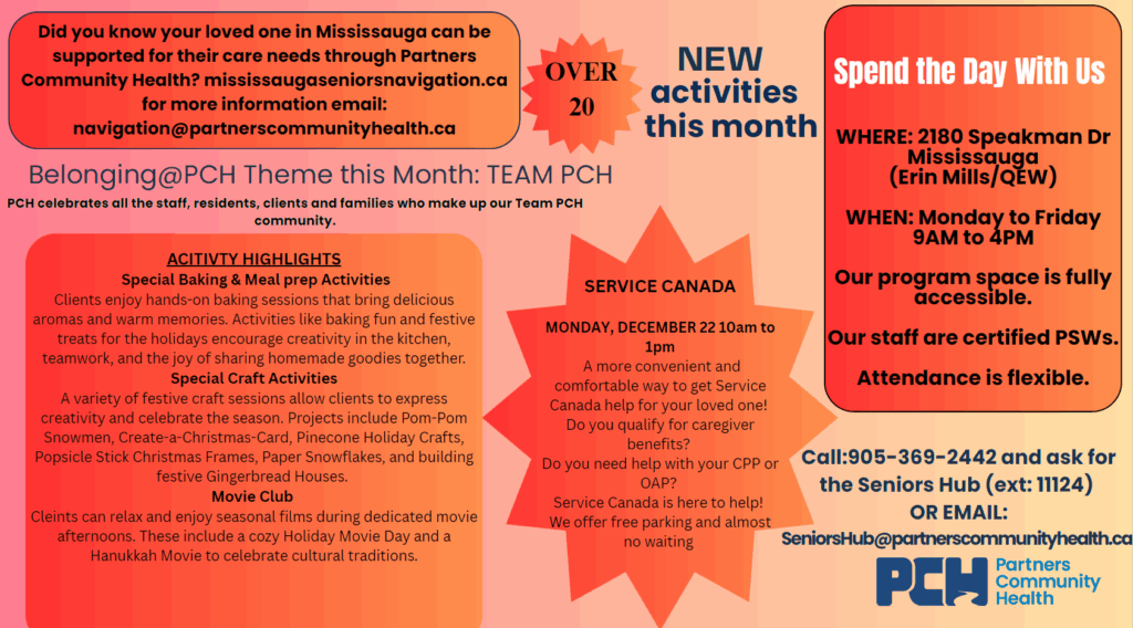 Hosted at Wellbrook Place’s Seniors’ Hub, our community programs provide an opportunity for Seniors living in Mississauga to benefit from the services and expertise of our team at Partners Community Health.